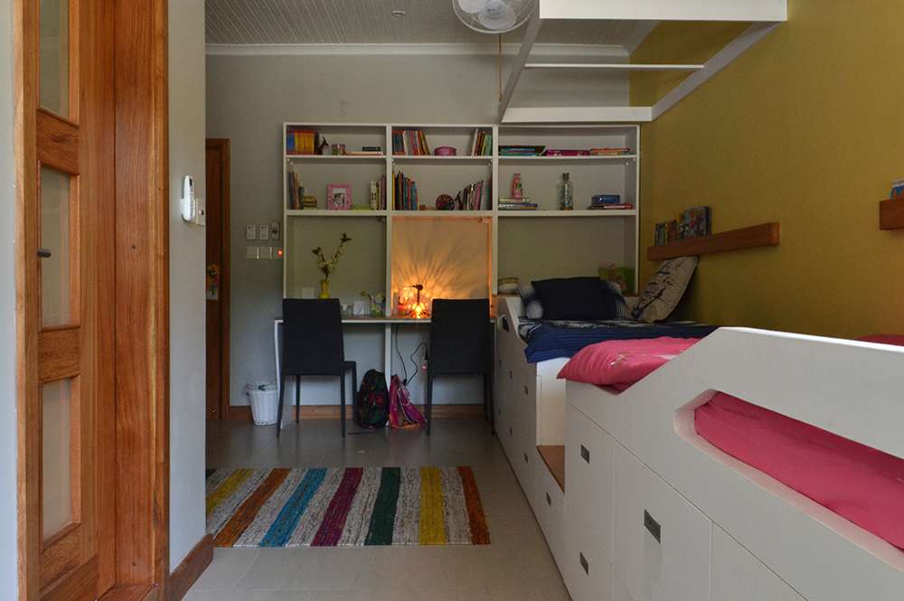 The brief was to maximise free floor space by integrating all 3 elements; beds, storage & study desks into one unit in an otherwise single bedroom. The room was intended for sharing between a sister & brother & as such the colour palette chosen is neutral with soft elements such as bedsheets to give identity but retain flexibility for future uses.