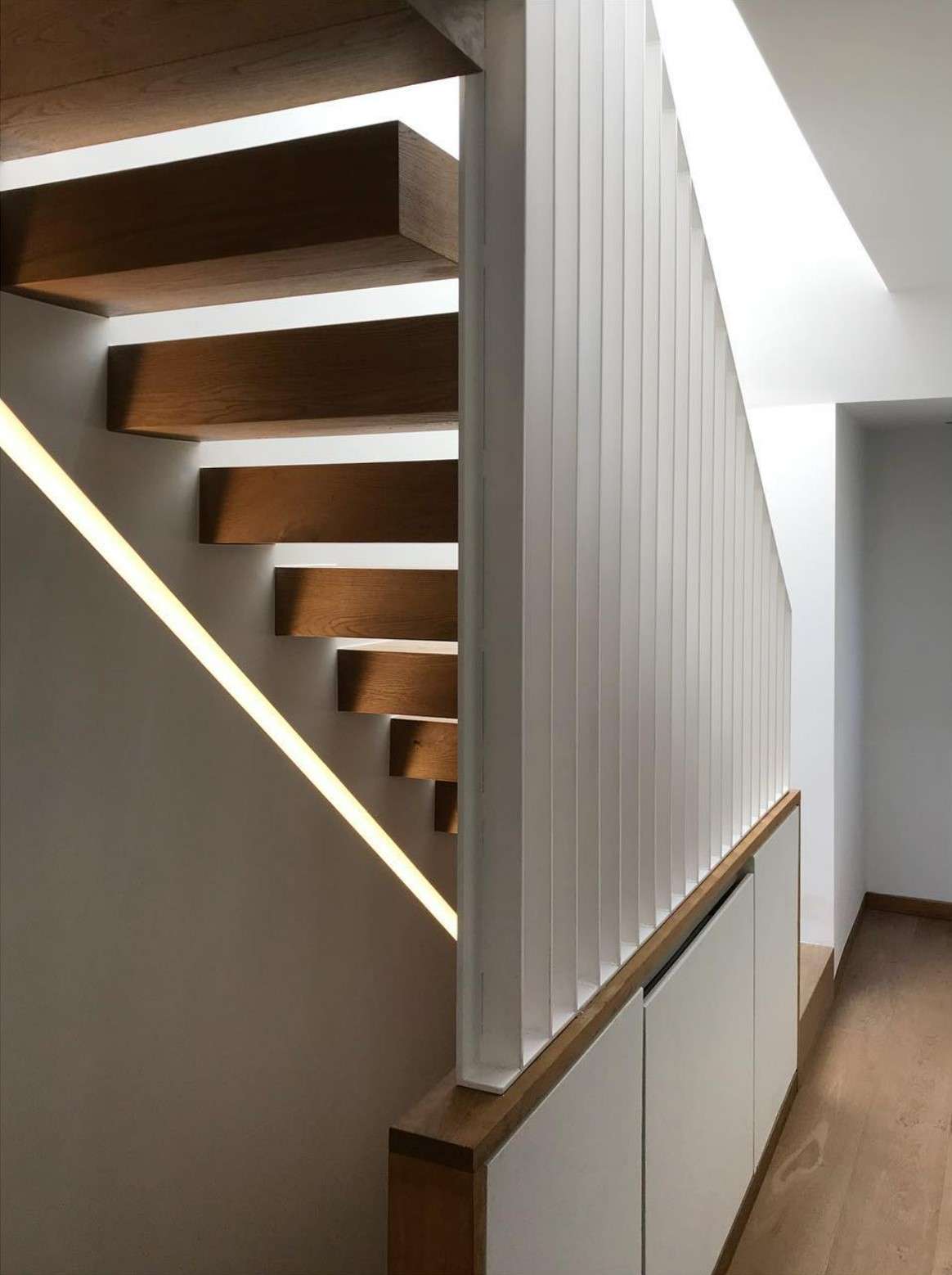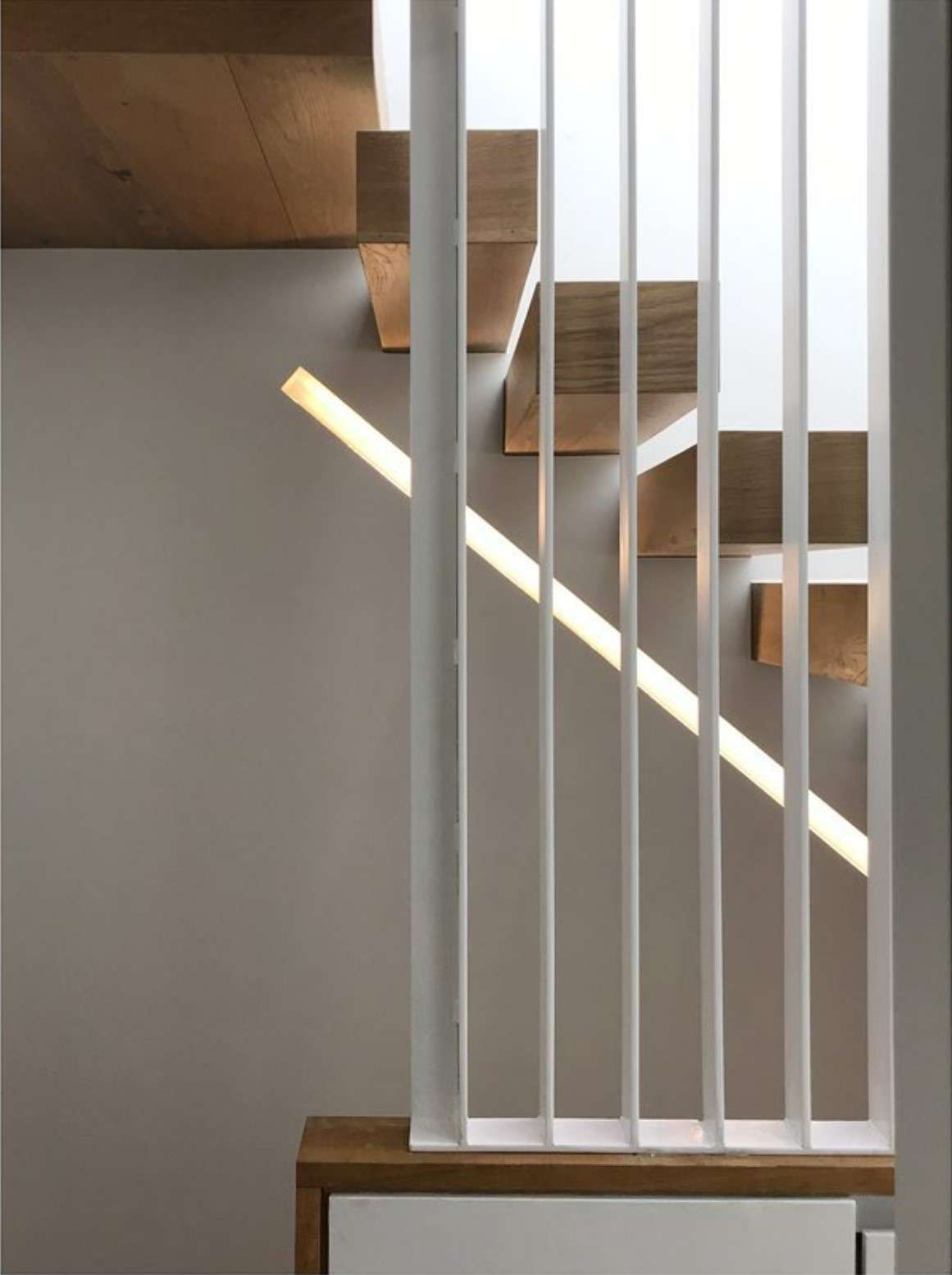 The design comprises a mansard loft addition on top of a terraced house in a conservation area. The mansard consists of a large roof light for the new stairwell. The cantilevered staircase carefully weaves in with the existing modern interiors of the house with minimal disruption. The balustrade was fabricated off-site.